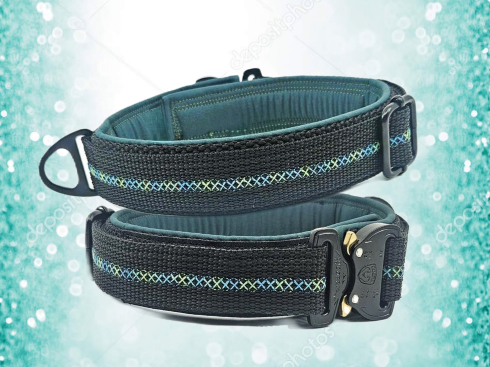 Dieses Halsband setzt auf Stil! Das tiefe Schwarz, kombiniert mit dem feinen grünen Zierstich und softem Softshell-Innenfutter, sorgt für maximalen Tragekomfort – und der robuste Cobra-Verschluss macht es zum sicheren Lieblingsstück bei jedem Abenteuer.