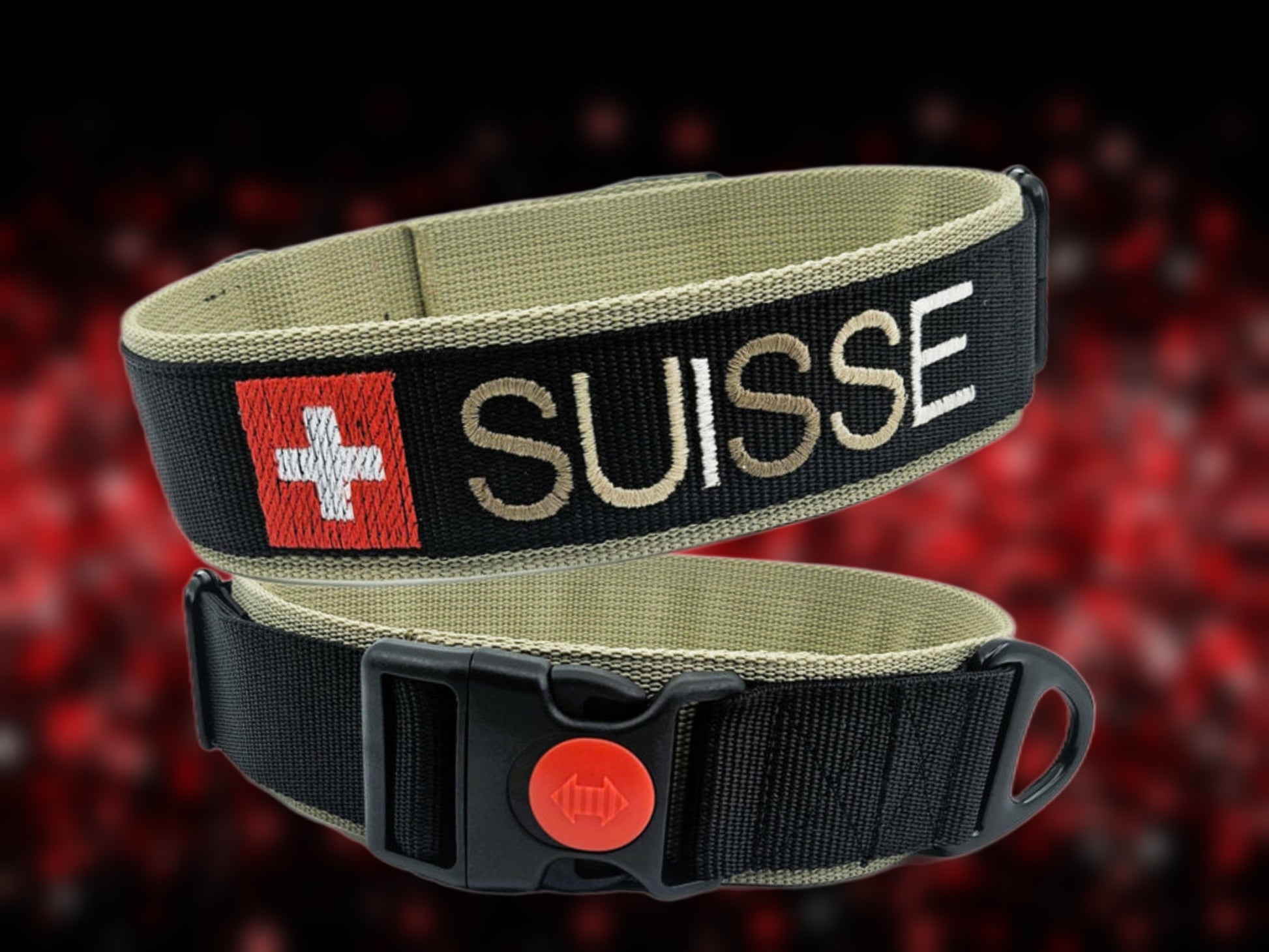 Dieses markante Halsband mit „SUISSE“-Stickerei und Schweizer Flagge vereint patriotischen Stil mit Stabilität. 🇨🇭✨