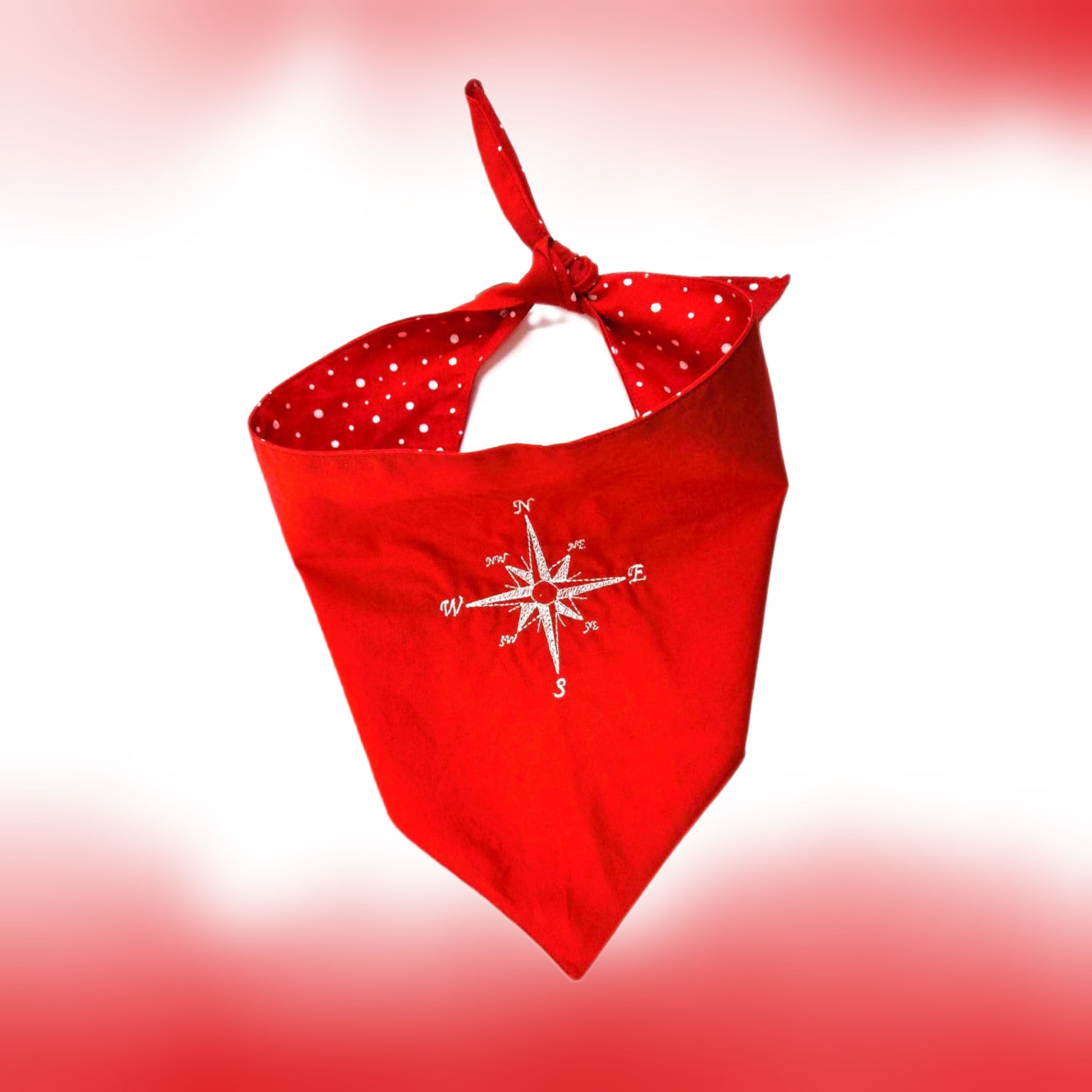 Dieses leuchtend rote Hundehalstuch mit aufgestickter Windrose bringt Abenteuerlust und Stil perfekt zusammen. Die Innenseite mit weissen Punkten rundet das Design verspielt ab. Ein echter Eyecatcher auf jedem Spaziergang! 🐶✨